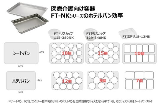 FTドリスNKおよびFT温デリNKシリーズは、ホテルパンやシートパンに効率よく収納できるよう設計されています。例えば、FT温デリ18-13NKはシートパンに18個、ホテルパンに12個収納可能です。