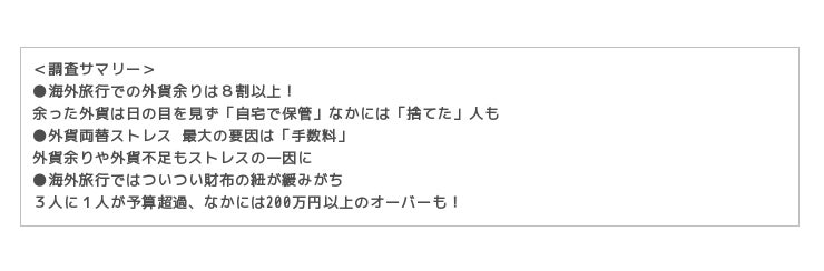 調査の結果、海外旅行で外貨を余らせた経験のある人は86.5%と大多数にのぼり、その3分の2は余った外貨の使いみちに困り自宅で保管したり、なかには捨ててしまったりと、旅行後は外貨がお金として活用されていない実態が明らかになりました。一方で、外貨両替の手数料に対してストレスを感じていることや、海外旅行での支出額については3人に1人が予算をオーバーしていることも判明しました。
