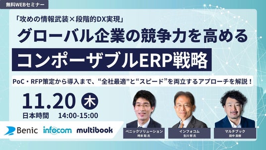グローバルクラウドERPサービス「multibook(マルチブック)」を提供する株式会社マルチブック(東京都品川区、代表取締役社長:渡部 学)は、ベニックソリューション株式会社(代表取締役社長 二之湯 秀幸 氏)、インフォコム株式会社(代表取締役社長 黒田 淳 氏)と共同でWebセミナー、『「攻めの情報武装×段階的DX実現」--グローバル企業の競争力を高めるコンポーザブルERP戦略』を開催いたします。