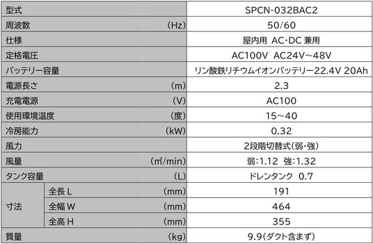 今回レンタルを開始する「エコやん」は、据え付け工事が不要で、持ち運び可能なコンパクトタイプの充電式スポットクーラーです。従来のスポットクーラーは、電源が必要なため、足場の上や仮設エリアなど、電源の確保が難しい場所での設置が困難で、設置後の移動も手間がかかっていました。「エコやん」はバッテリーで使用ができるため、電源が取れない場所でも使用でき、必要に応じて容易に持ち運びや設置が可能です。また、付属の電源・充電兼用のACアダプターは100V電源に対応しています。