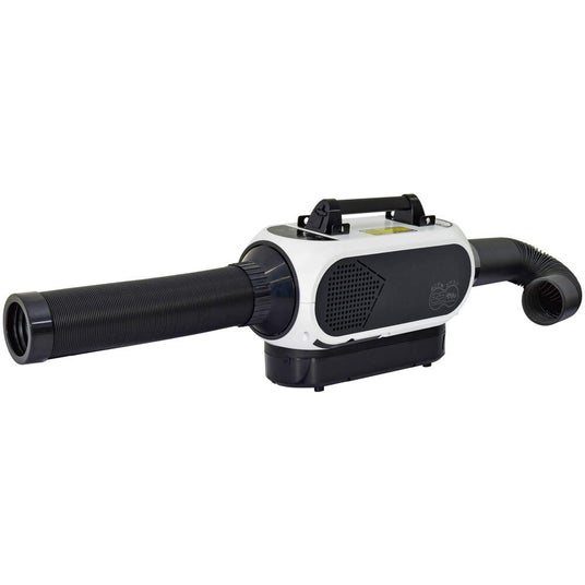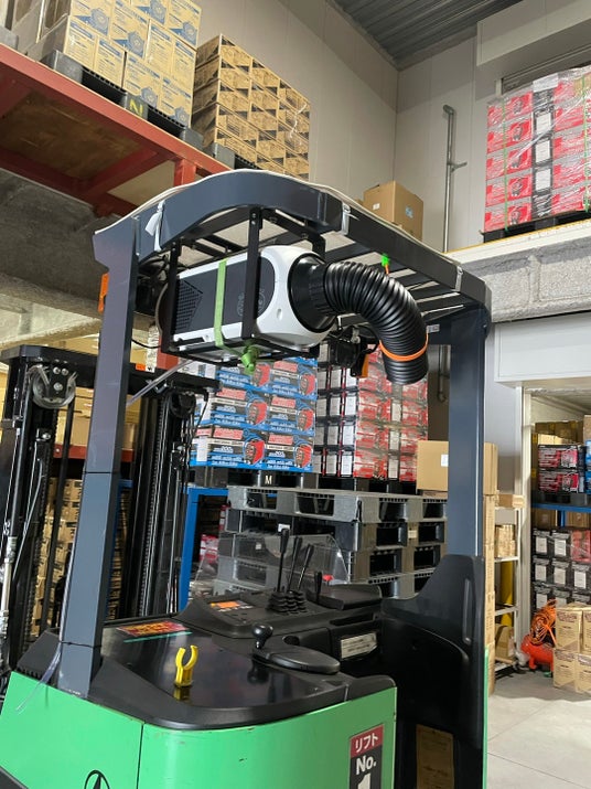 専用のバッテリーユニット使用時には、冷風で最大4.5時間、送風では最大40時間の連続使用が可能で、フォークリフトの上部に取り付けるなど、現場作業員の熱中症対策に有効です。吹出口付近は、周囲温度よりマイナス8度の冷風が送り出されるため、体感的にも高い冷却効果が期待できます。
