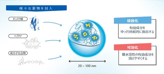 既存の徐放化技術※4や血中半減期延長技術※5に比べ、封入時に有機溶媒を使わないため有機溶媒で活性を失いやすいタンパク質にも適用可能なこと、薬物の化学構造の改変が必要ないことが特長です。また、既存の可溶化剤※6と比較して、少量で可溶化できること、従来は適用が難しかった成分(難水溶性ペプチドなど)にも適用可能なこと、安全性が高いといった強みがあります。