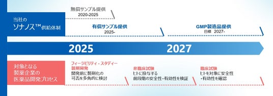 このたび、製薬企業などに「ソナノス(TM)」を用いた医薬品の非臨床試験や臨床試験への移行を安心して進めていただけるよう、品質保証付きの有償サンプル提供を開始し、供給契約に応じる体制を整えました。「ソナノス(TM)」単独の安全性データ※8の拡充も予定しており、2027年のGMP製造品提供開始を目指しています。