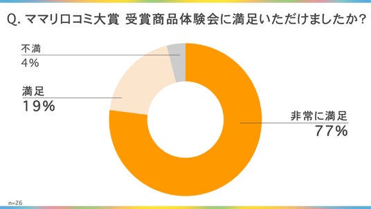 アンケートの結果、「ママリ口コミ大賞 受賞商品体験会」に対する満足度は96%と非常に高い結果となりました。「お土産・お試しがあったこと」に加え、「企業の方と直接お話し・交流できたこと」が主な満足の理由として挙げられており、参加したインフルエンサーにとって、商品理解が深まる有意義な機会となりました。