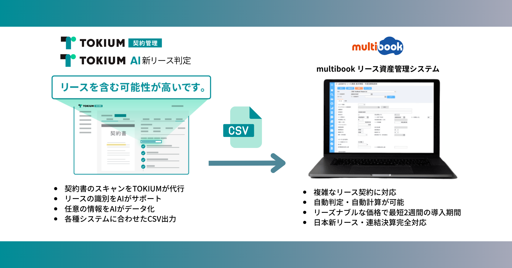 新リース会計基準対応クラウドERP「multibook(マルチブック)」を提供する株式会社マルチブック(本社:東京都品川区、代表取締役社長:渡部 学、以下「当社」)は、経理AIエージェントを提供する株式会社TOKIUM(本社:東京都中央区、代表取締役:黒崎 賢一、以下「TOKIUM」)と連携を開始し、企業の新リース会計基準対応支援を強化したことをお知らせいたします。