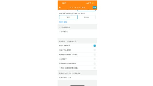 業務開始前に「水分携帯の有無/服装/体調申告/休憩場所の確認」などの対策チェックリストをスマートフォンで入力
