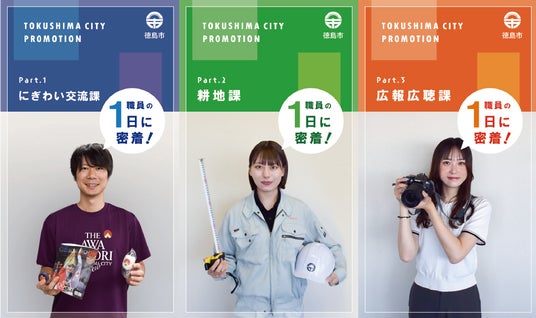 徳島市職員を目指す人に向けて、より身近に徳島市で働くイメージを持ってもらうため、3人の若手職員が出演し、徳島市役所の仕事内容や魅力など職員の1日(日常業務)を紹介したショート動画(徳島市職員が企画制作)を公開しています。