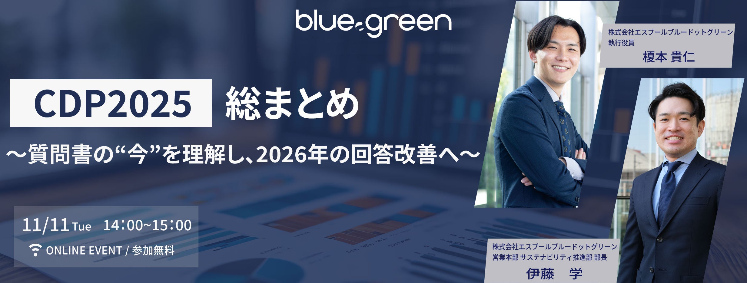 株式会社エスプールブルードットグリーン(本社:東京都千代田区、取締役社長:八林公平、以下「当社」)は、2025年11月11日(火)14:00より、無料オンラインセミナー「CDP2025総まとめ~質問書の“今”を理解し、2026年の回答改善へ~」 を開催します。