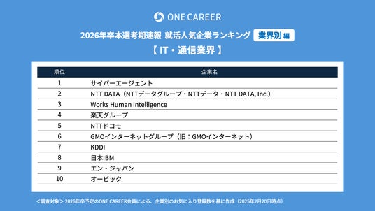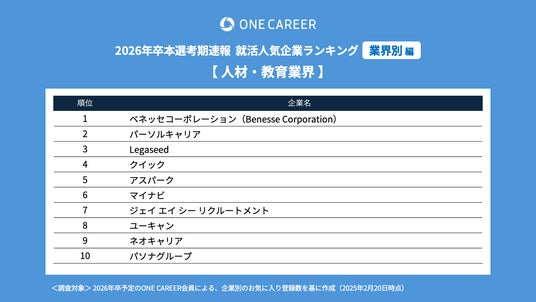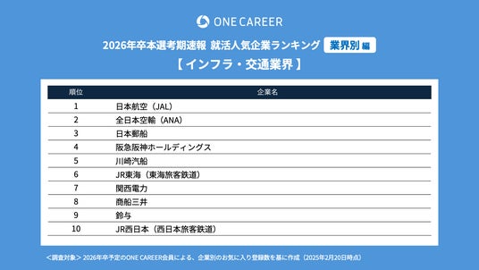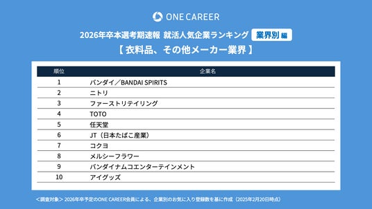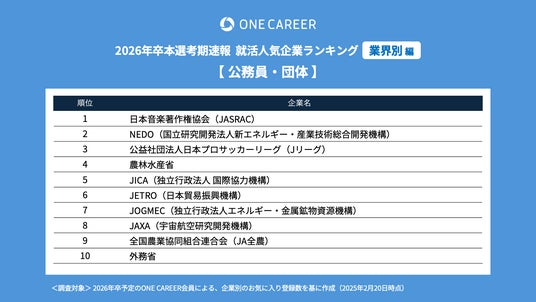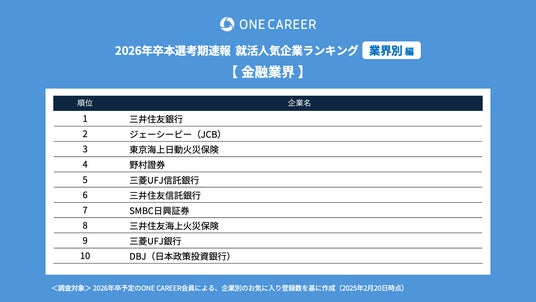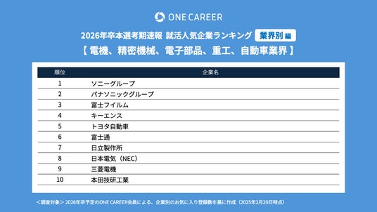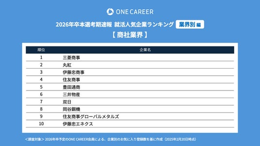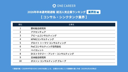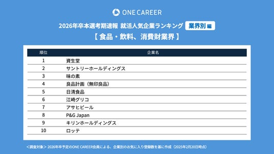 “はじめてのキャリアを選ぶ、就活サイト”「ONE CAREER」を運営する株式会社ワンキャリア(本社:東京都渋谷区、代表取締役社長 執行役員CEO:宮下 尚之、以下ワンキャリア)は、「ワンキャリア就活人気企業ランキング【業界別編】26卒本選考期速報」を発表しました。