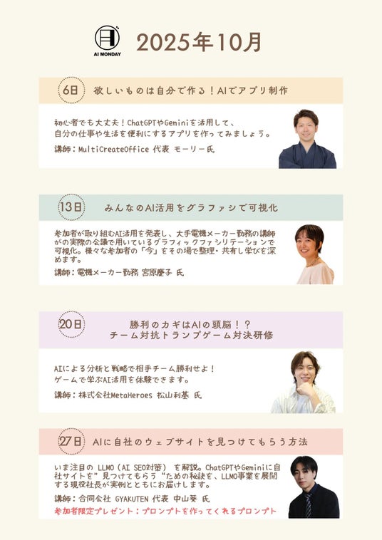 株式会社MetaHeroes(本社所在地:大阪府大阪市、代表取締役:松石和俊、以下「当社」)が運営する生成AIコミュニティ「AI MONDAY」は、2025年10月の開催スケジュールを公開しました。10月は「アプリ制作」や「グラフィックファシリテーション」、「AIを活用した分析・戦略」「LLMO(AI SEO対策)」といった多彩なテーマを、第一線で活躍する講師陣が登壇します。