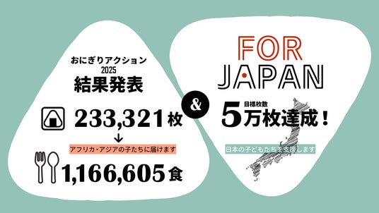 日本発、世界の食料問題の解決に取り組む、特定非営利活動法人TABLE FOR TWO International(以下、TFT)は、国連が定めた10月16日「世界食料デー」(世界中の人が食べ物や食料問題について考える日)を記念し、「おにぎりアクション2025」を本年10月7日(火)から11月15日(土)まで開催しました。40日間で合計23万3,321枚のおにぎり写真が投稿され、アフリカ・アジアの子どもたちに116万6,605食を届けることができることをお知らせします。また、特別企画として、「おにぎりアクション FOR JAPAN」を11月18日(火)から11月30日(日)まで開催しました。5万枚の投稿を達成し、日本の子どもへ食の支援を届けることが決定しました。