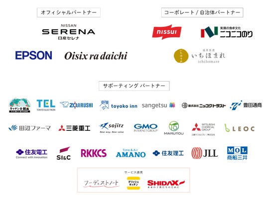 サポーティングパートナー:キッチンde給食、東京エレクトロン、象印マホービン、東横イン、サンゲツ、ニッコクトラスト、豊田通商、田辺ファーマ、三菱重工業、双日、GMOインターネットグループ、丸東、三菱ケミカルグループ、LEOC、住友電気工業、SI&C、RKKCS、アマノ、住友理工、ジョーンズ ラング ラサール、商船三井、フーディストノート、デリッシュキッチン、シダックスコントラクトフードサービス