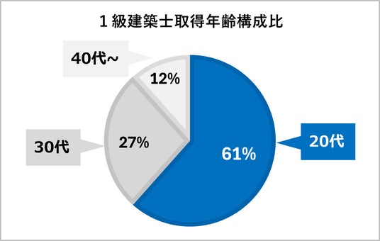 近年、社会全体として一級建築士試験の合格者の年齢層が若年化しており、合格者の6割以上が20代という状況があります(図1)。若手のうちに資格を取得することが、将来のキャリア形成において大きなアドバンテージとなることが明らかになっています。加えて、近年の試験では製図課題の情報量や自由度が増すなど、難易度が上昇傾向にあり、計画的かつ体系的な学習支援の必要性が高まっています。