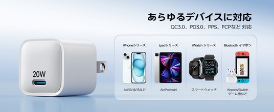 PD3.0・QC3.0など各種規格に対応しており、幅広いデバイスでご利用いただけます。