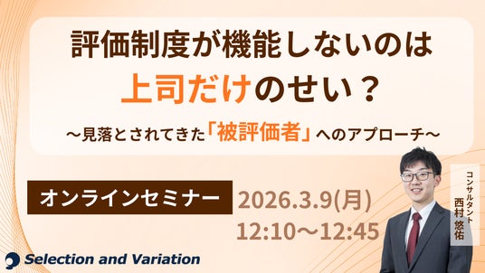 組織・人事コンサルティングファームであるセレクションアンドバリエーション株式会社(以下、当社、東京都千代田区丸の内、大阪市西区、名古屋市西区 / 代表取締役社長:平康慶浩/ URL:https://sele-vari.co.jp/ )は『評価制度が機能しないのは上司だけのせい? ~見落とされてきた「被評価者」へのアプローチ~』セミナーを2026年3月9日(月)12:10~12:45に開催することをお知らせいたします。