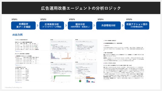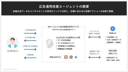 ブランディングテクノロジー株式会社(代表取締役社長:木村 裕紀、本社:東京都渋谷区、証券コード7067、以下当社)は、株式会社ジーニー(代表取締役社長:工藤 智昭、本社:東京都新宿区、証券コード6562)のグループ会社であるJAPAN AI株式会社(代表取締役社長:工藤 智昭、本社:東京都新宿区、以下、JAPAN AI)との資本業務提携に基づく共同開発プロジェクトの第一弾として、「広告運用改善AIエージェント」を開発したことをお知らせします。