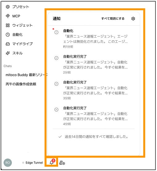 自動化の実行結果(完了・失敗)やエージェント無効化のお知らせを、通知センターでリアルタイムに確認・管理できるようになりました。