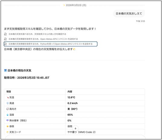 外部ツール(MCP)で取得したデータをスキルでファイルとして保存処理をし、マイドライブに保存やメールにそのまま添付するなどの処理を実行できるようになりました。(例:Google Drive内の文書分析、PDFレポート作成、およびGmail送信など)