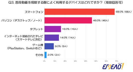 - 最も多く利用されているデバイスは「スマートフォン」で68.0%(68人)と圧倒的で、持ち運びやすさと即時アクセス性が日常的な視聴を支えています。
