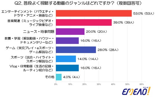 - 次いで「音楽関連(ミュージックビデオ・ライブ映像など)」が39.0%(39人)と高い割合を占め、映像と音楽を組み合わせたコンテンツの人気の高さが際立ちます。