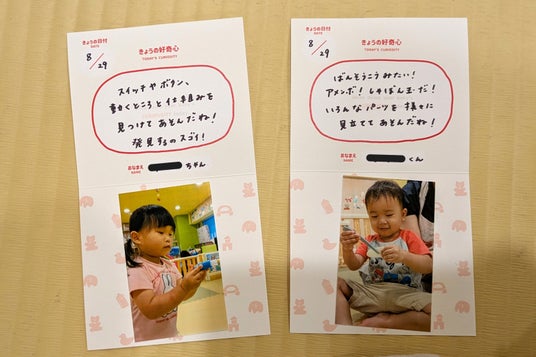 コトフィスを利用する子どもたち(一時預かり保育含む)に毎月異なるテーマで、好奇心はじける時間をお届け。ピープルはその姿を観察し、ご自宅にお持ち帰りいただける「今日の好奇心カード」としてプレゼントします。また、観察して得られた気づきはピープルの商品開発のタネとして活用させていただきます。