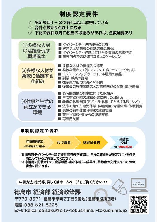 - 徳島市が定める「ダイバーシティ経営」認定項目に関して、一定の基準以上、取り組んでいる企業