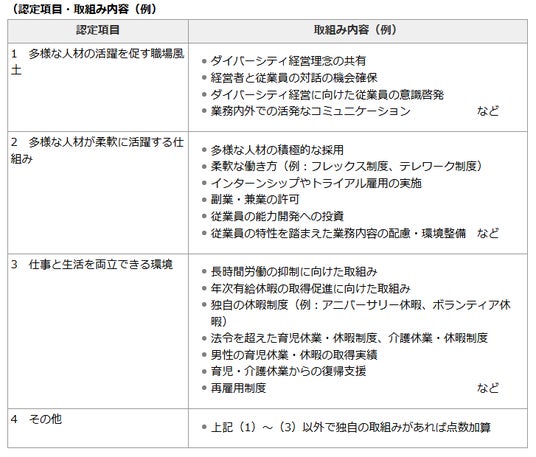 - 平成29年度から令和3年度まで実施していた「ワークライフバランス推進事業」において「徳島市職場環境改善・働き方改革宣言企業」として承認・公表されている企業も、徳島市ダイバーシティ経営企業の認定申請ができます。