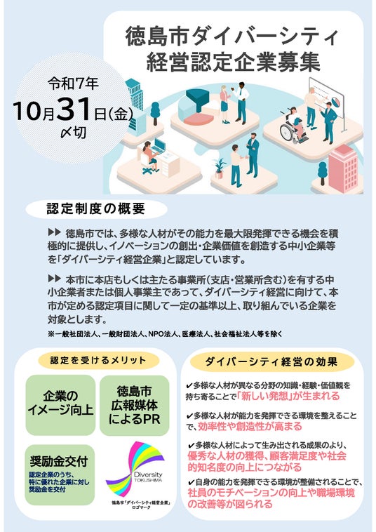 徳島市では、多様な人材がその能力を最大限発揮できる機会を積極的に提供し、イノベーションの創出・企業価値を創造する中小企業等を「ダイバーシティ経営」と認定しています。