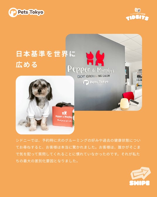PetsTokyoの成長背景として、2023年に東京・飯田橋で小さなグルーミングサロンとしてスタートしたこと、そこからわずか数年で日本国内に複合型サービスの拠点を増やし、海外(オーストラリア・シドニー)へも展開していることが紹介されています。