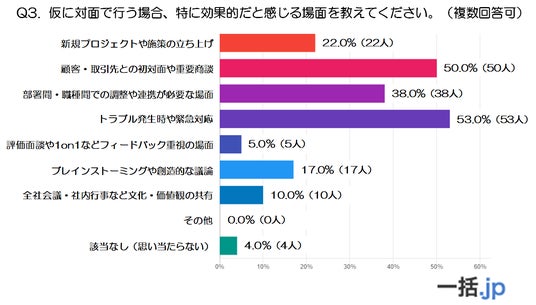 - 最も多かったのは「トラブル発生時や緊急対応」で、53.0%(53人)を占めました。予期せぬ事態や迅速な対応が求められる場面では、直接会うことで、状況をすぐに把握し、即座に対応できる点が重要視されています。