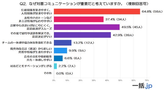 - 最も多かったのは「信頼関係を築きやすく、人間関係が深まりやすい」で、64.8%(59人)にのぼりました。対面のやり取りが、人間関係を強固にする手段として特に重視されていることがうかがえます。