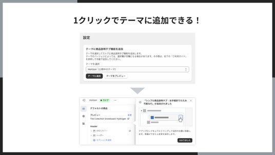 HTML や Liquid の編集は一切不要で、誰でも簡単に導入可能です。