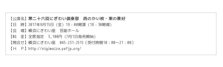 9月15日に開催する「第二十六回にぎわい倶楽部 西のかい枝・東の兼好」では、江戸落語と上方落語それぞれの異なる成り立ちや特徴、演じ方や内容の違いなどを、噺家による対談と実演で浮き彫りにします。今回、上方落語はその特徴の一つでもある「ハメモノ入り」で行います。