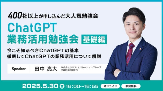 ChatGPTの基礎から、具体的なビジネス活用事例までを分かりやすく解説する勉強会を開催します。すでに400人以上が受講し、その効果を実感しています。ChatGPTをビジネスのインフラとして活用し、業務効率化を図りたい方は、ぜひご参加ください。