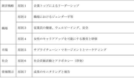 これは、企業が事業活動を通じて女性の活躍を促進し、より公平で持続可能な社会を築くための指針となるもので、以下7つの原則から構成されています。
