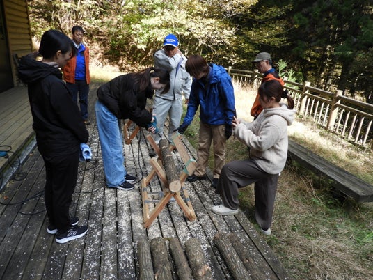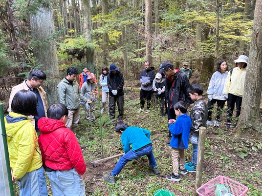 2024年度は豪雨の影響により活動を実施できませんでしたが、今回は天候にも恵まれ、参加者数も過去最多となり、非常に活発な活動となりました。当日は、松山流域森林組合による伐倒デモンストレーションを見学した後、伐倒木の枝払いや広葉樹の植樹といった森林整備活動、森林インストラクターと落ち葉拾いをしながらの森林散策、しいたけの植菌、薪割りなど自然と親しむ活動が実施できました。