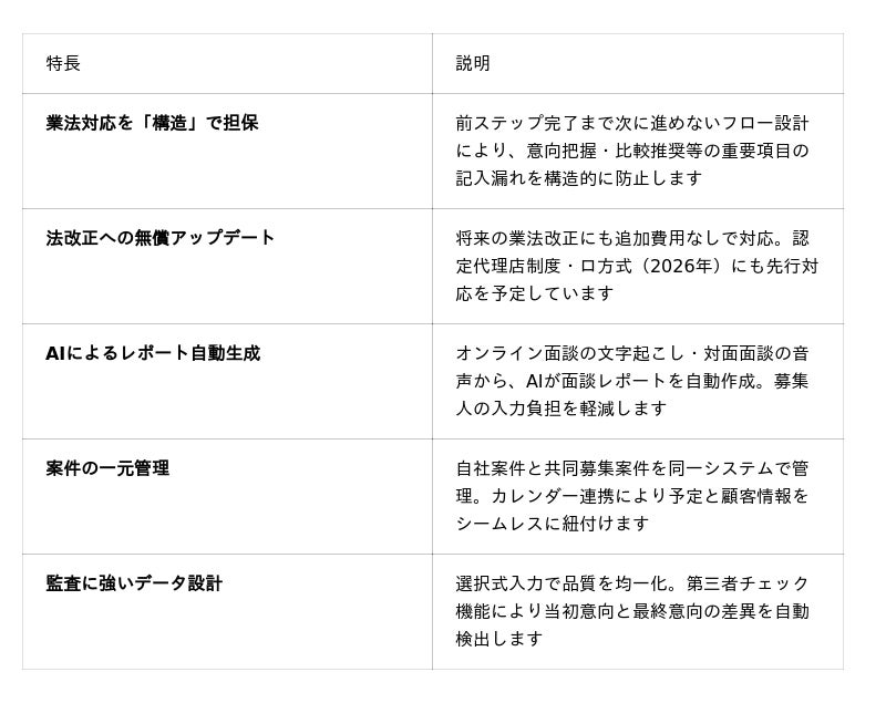 保険業界では、業法改正への対応や募集人ごとの面談記録品質のばらつき、複数システム併用による二重入力・管理コスト、監査対応に必要な証跡管理の煩雑さなど、多くの代理店が業務品質と業務効率の両面で課題を抱えています。