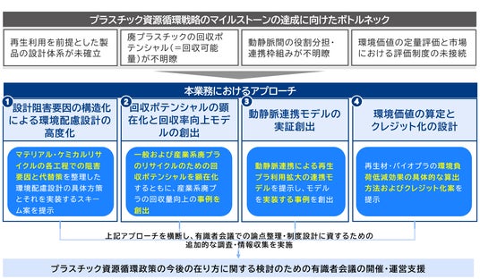 本業務では、プラスチック資源循環に関する国内外の動向や企業・自治体等の取り組みを調査・分析するとともに、有識者会議の開催を通じて資源循環戦略の実現に資する政策を検討します。