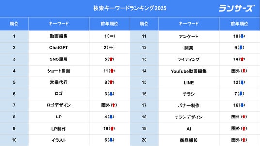 「動画編集」(1位)、「ショート動画」(4位)、「YouTube動画編集」(14位)、「SNS運用」(3位)など、動画・SNS関連のキーワードが多数上位に入りました。