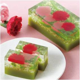 透き通った錦玉羹に赤とピンクの羊羹を合わせ、カーネーションを表現しました。
