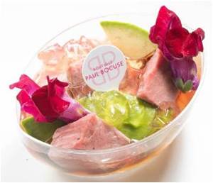 エディブルフラワーをあしらったローストビーフとアボカドのジュレ仕立て 561円/地下1階