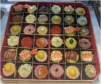 まるで小花を敷き詰めたような、一口サイズのミニ寿司の詰め合わせ。