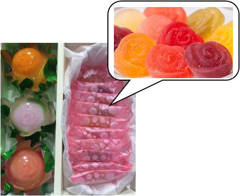 バラ型ゼリーを閉じ込めたゼリーと、希少なアロマを使ったバラ型フルーツゼリーの詰め合わせ。
