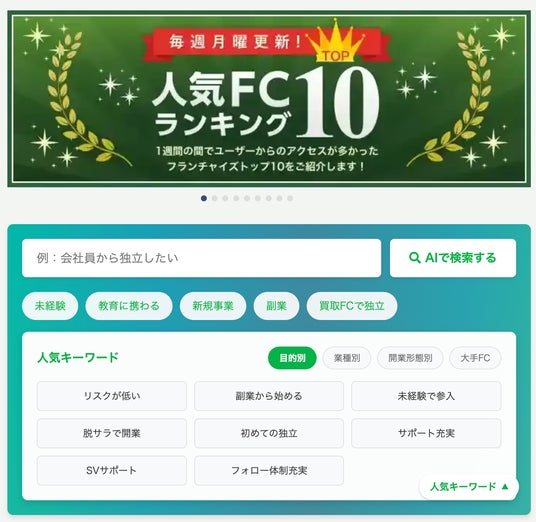 株式会社じげん(本社:東京都港区、代表取締役社長執行役員CEO:平尾丈、東証プライム:3679)が運営する、日本最大級のフランチャイズ情報比較サイト「フランチャイズ比較.net(https://www.fc-hikaku.net/)」は、最新の生成AI技術を活用し、ユーザーが入力した言葉のニュアンスや文脈を深く理解して最適なフランチャイズ案件を提案する「次世代AI検索機能」をリリースいたしました。