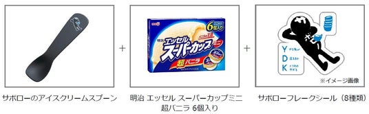 アイスクリームスプーン」「明治 エッセル スーパーカップミニ 超バニラ6個入り」 「サボローフレークシール」がセットで当たる