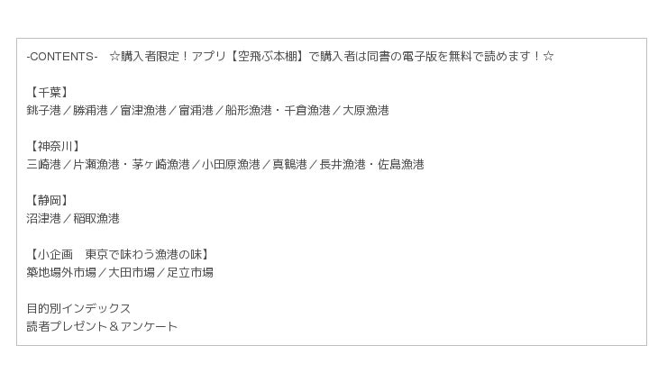 日本人は魚が大好き! 新鮮な魚であふれかえる港では、魚を知り尽くした人たちがどこにも負けない魚料理を追及してきました。同書には、その髄を極めた料理の数々、丹精込めて作られたおみやげ、ついでに寄れる観光地などを掲載。ぶらり漁港旅&市場旅に出かけましょう!