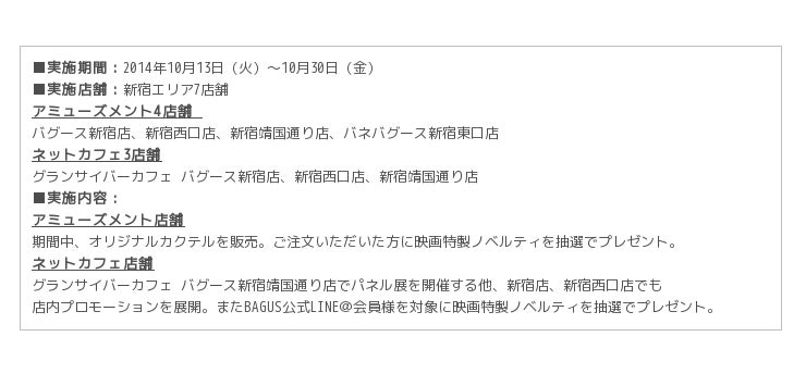 グランサイバーカフェ バグース新宿靖国通り店では期間中、本編画像パネル展を開催する他、