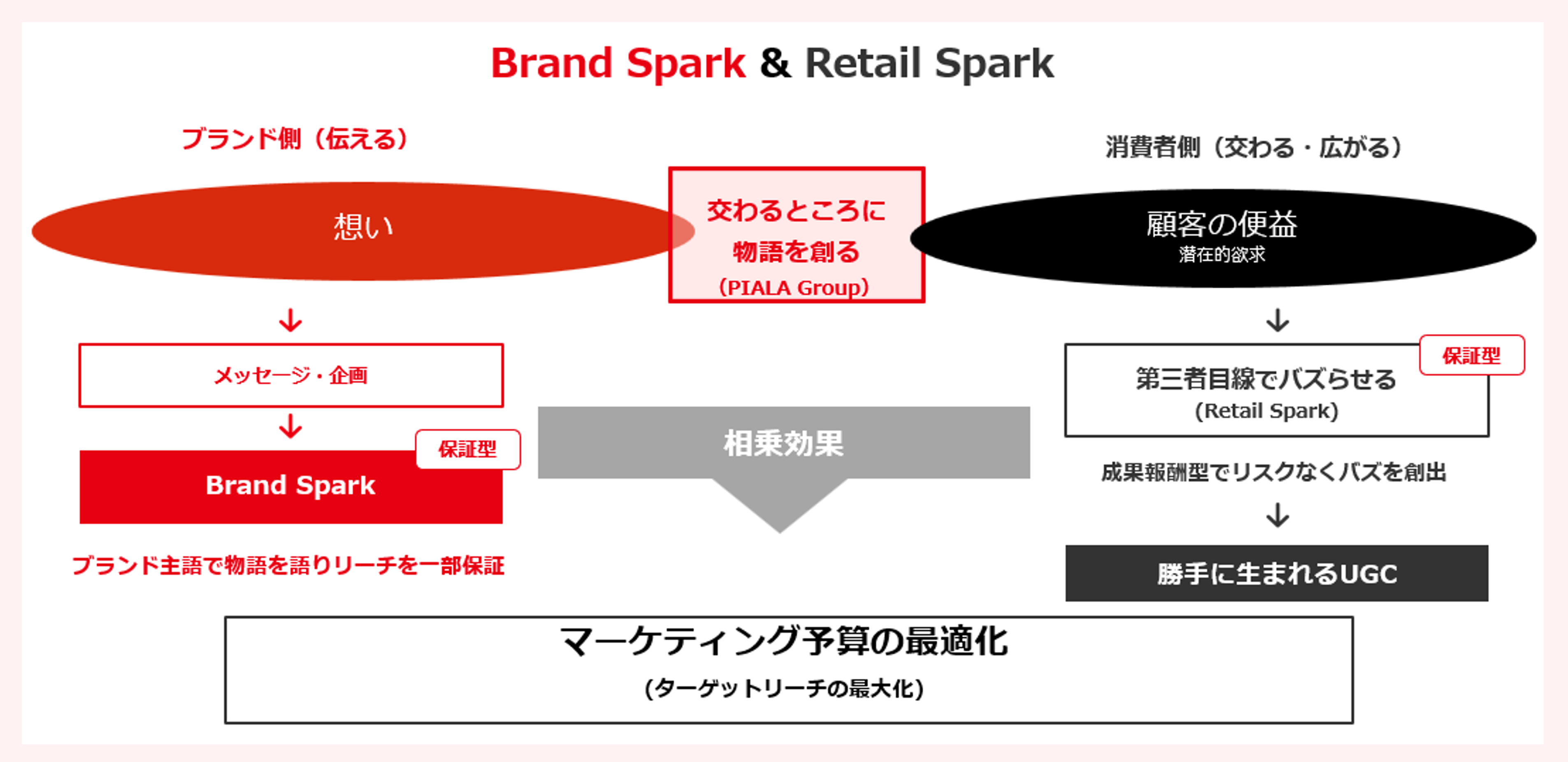Brand Sparkでは、ブランド目線で最低限のIMPを保証する独自のリーチ最適化ロジック「リーチマックス(Reach Max)」と、第三者目線でUGC創出を成果保証する「Retail Spark」を組み合わせることで、最低限“保証するIMP”を確実に担保します。