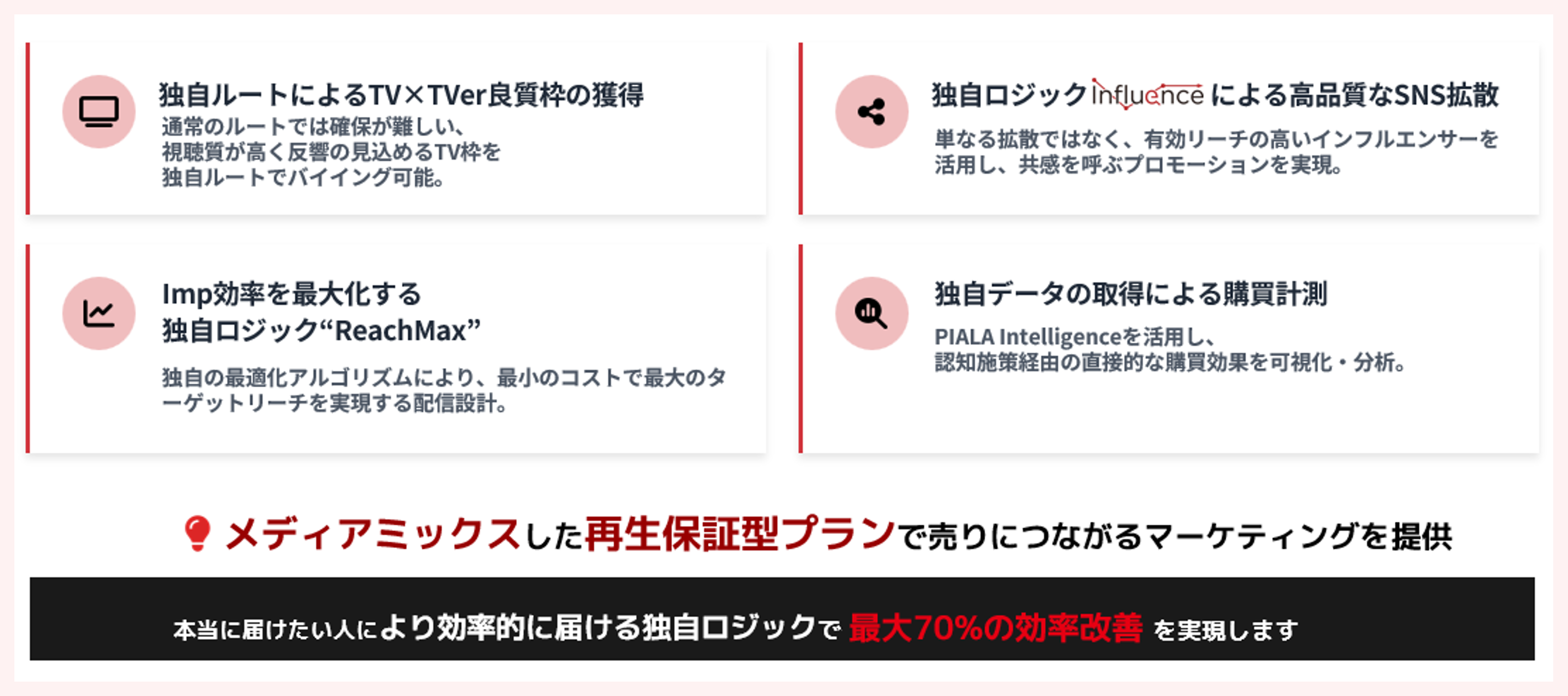 TV・OTT・Web・SNS広告を横断し、ターゲットリーチ効率を最大化することで、ペイド施策における費用対効果を最適化します。