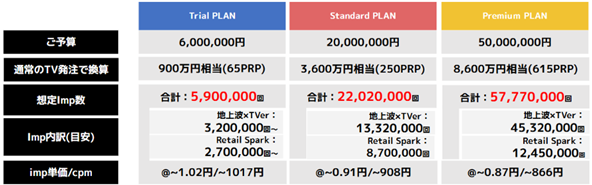 トライアルプラン(600万円)では、通常のTV広告換算で約900万円相当のリーチを実現しながら、SNS・インフルエンサー施策を組み合わせることで、広告費を超える影響量の創出を狙います。